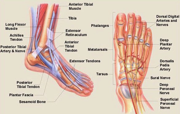 The three main parts of the foot: the anklebones known as tarsals, the middle bones that are felt on the top of the feet are metatarsals, and the toe bones known as phalanges.